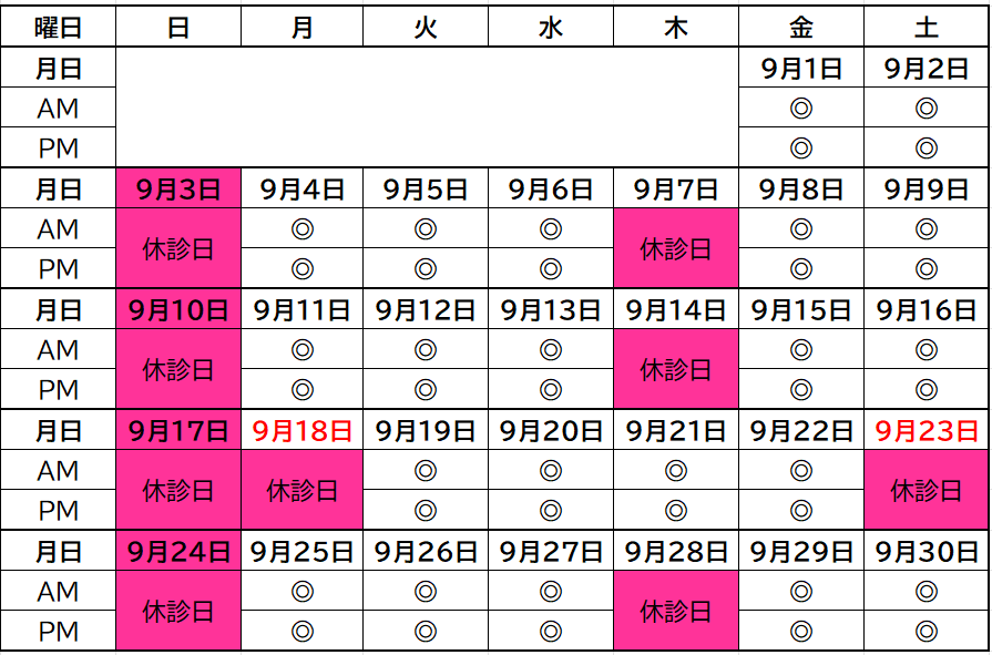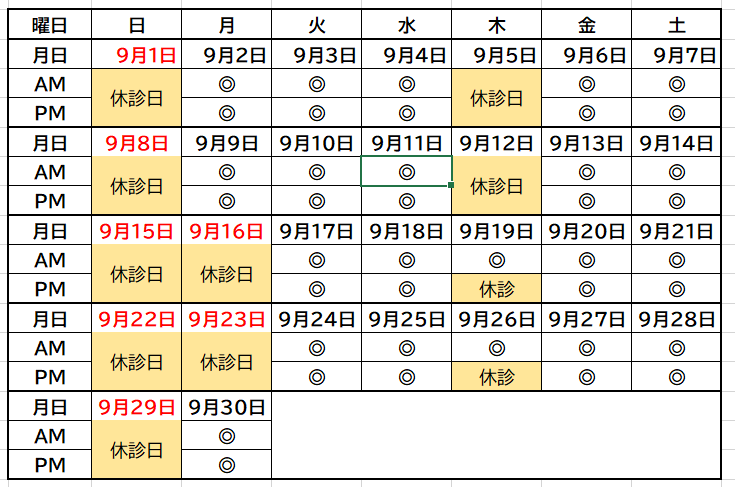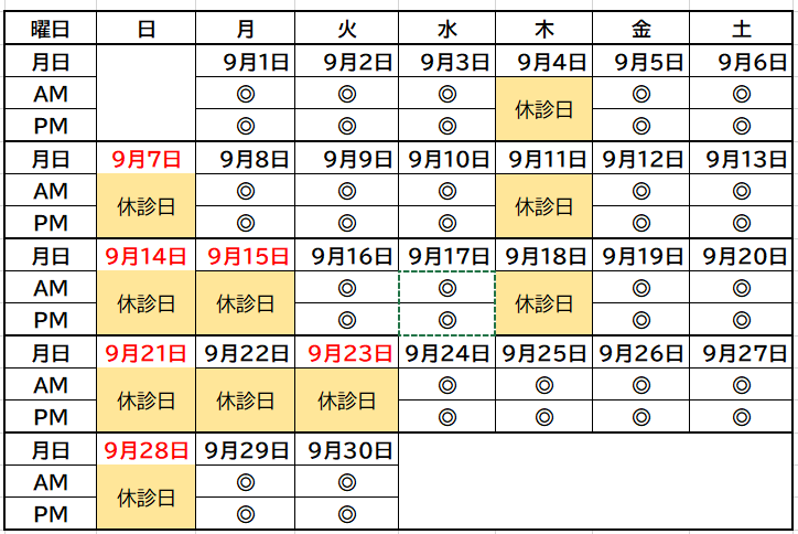 | 9月の休診日 | 02日(木) 09日(木) 16日(木) 20日(月) 敬老の日 23日(木) 秋分の日 |