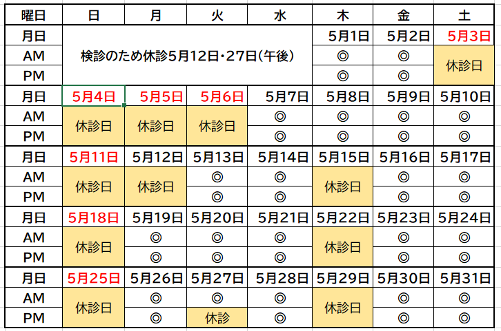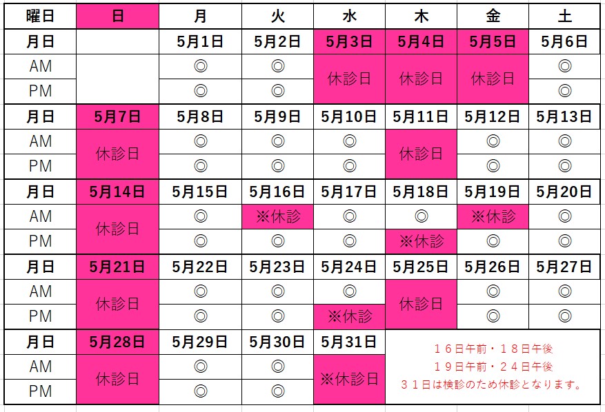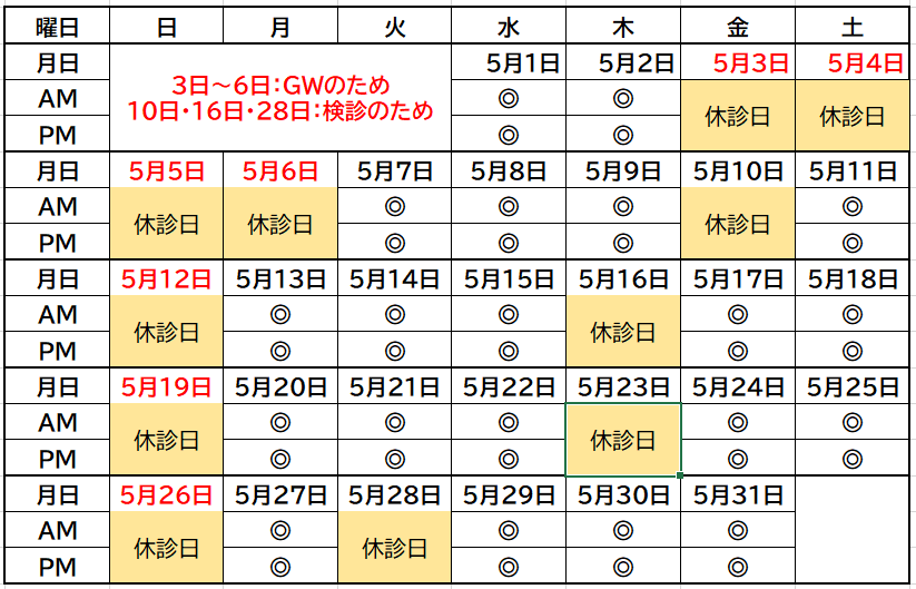 | 5月の休診日 | 3日(水)~5日(金) 休診日 11日(木) 休診日 16日(水) 午前休診(検診のため) 18日(木) 午後休診 19日(金) 午前休診(検診のため) 24日(水) 午後休診(検診のため) 25日(木) 休診日 31日(水) 休診日(検診のため) |