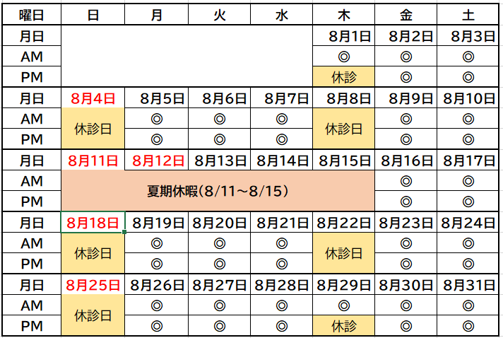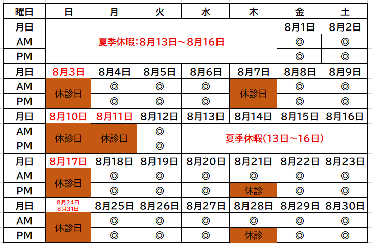 | 8月の休診日 | 05日(木) 09日(月)振替休日 13日(金)~16(月)夏季休暇 12日(木)・26日(木)は診療いたします |