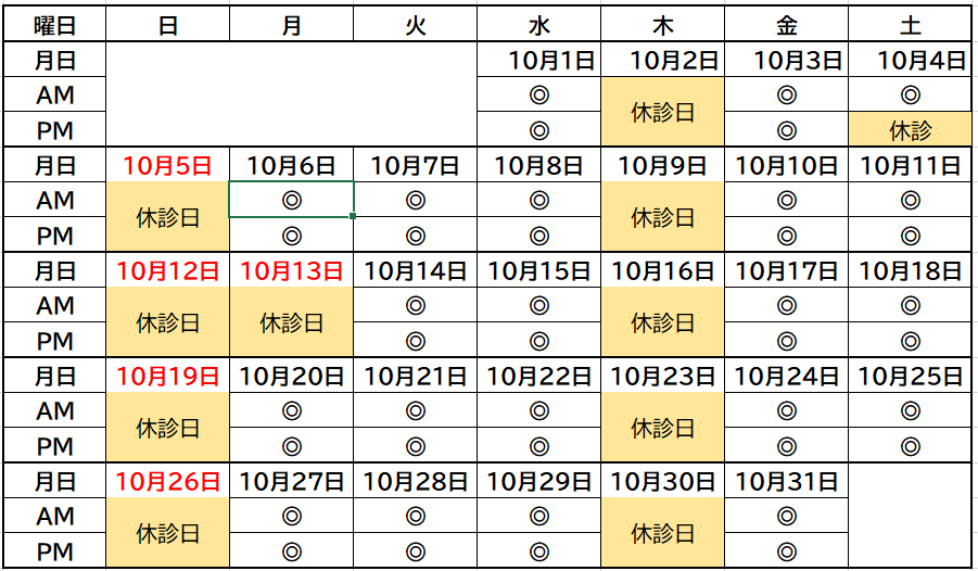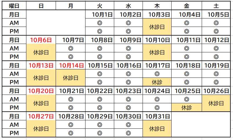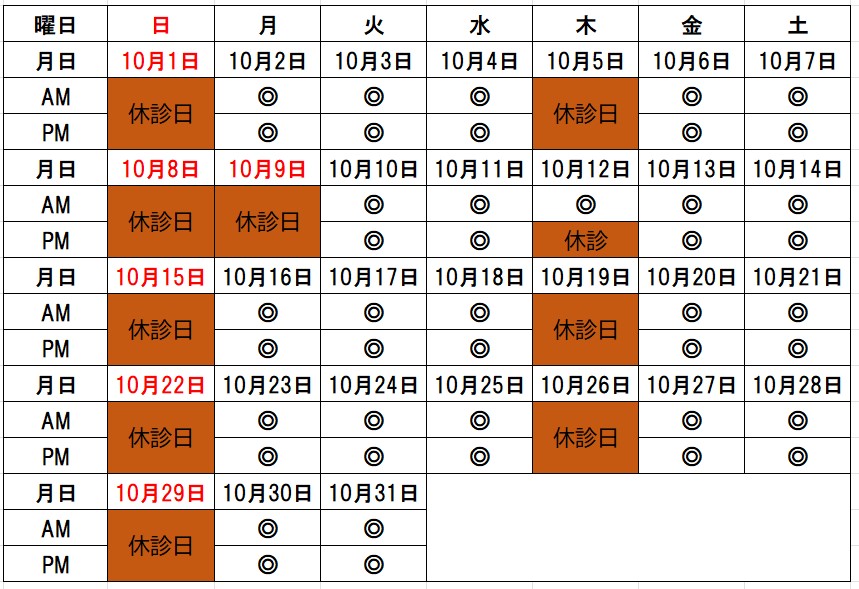 | 10月休診日 | 6日 13日(PM) 20日 27日 |