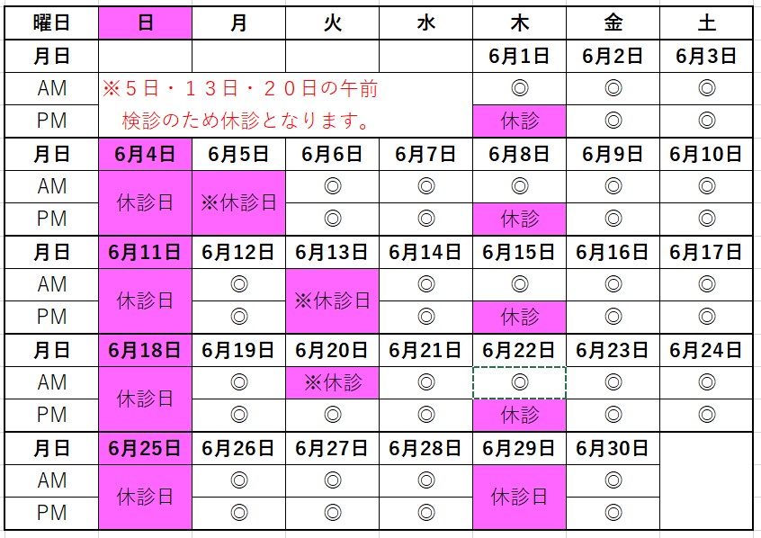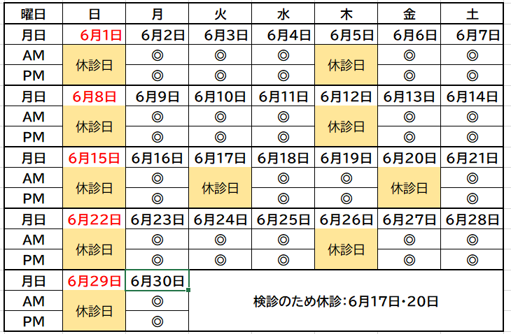 | 6月の休診日 | 01日(木) 午後休診 05日(月) 休診日(検診のため) 08日(木) 午後休診 13日(火) 休診日(検診のため) 15日(木) 午後休診 20日(火) 午前休診(検診のため) 22日(木) 午後休診 29日(木) 休診日 |