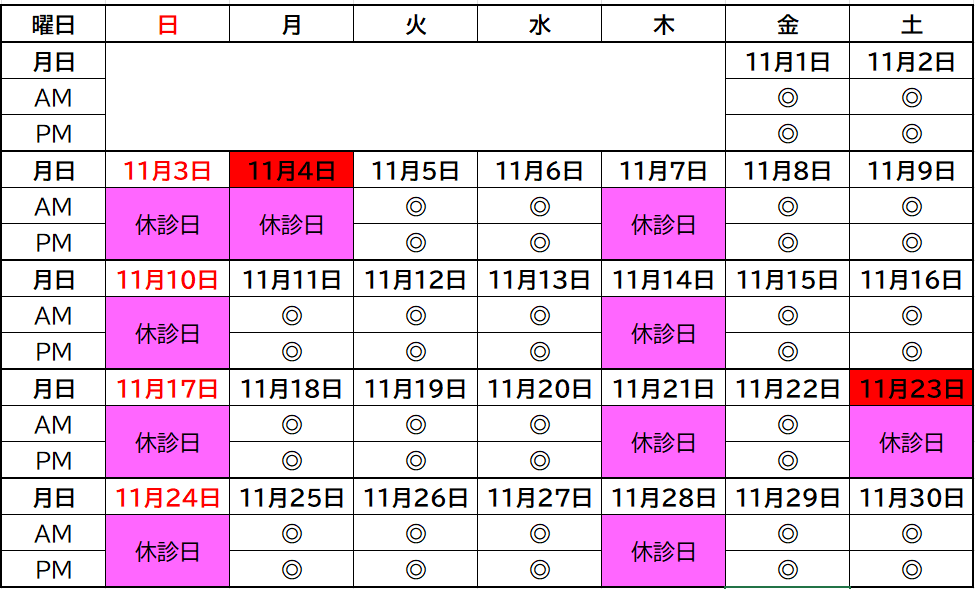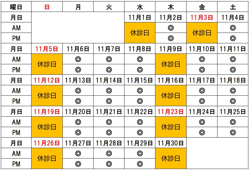 | 11月休診日 | 10日(木) 休診日 17日(木) 休診日 |