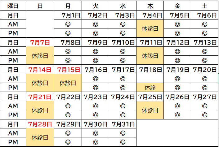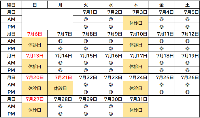 | 7月の休診日 | 01日(木) 08日(木) 15日(木) 22日(木) 海の日 23日(金) スポーツの日 29日(木) |