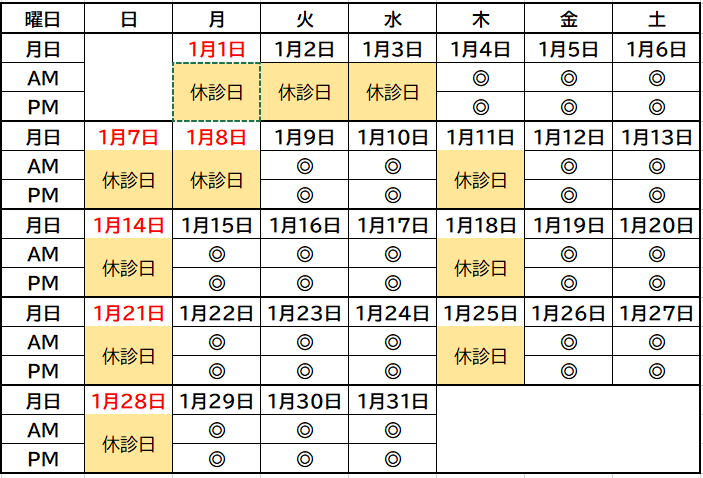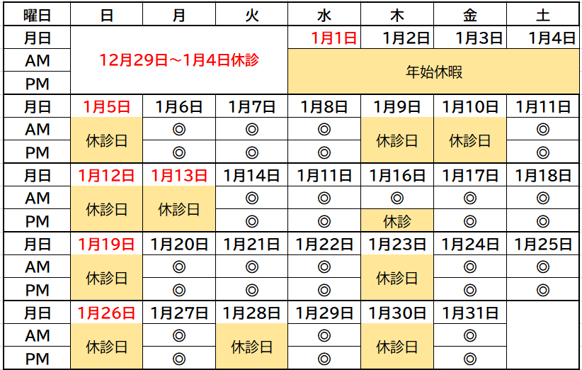 | 年末・年始の休診日 | 12月29日(木) 休診 12月30日(金) 休診 12月31日(土) 休診 1月1日(日) 休診 1月2日(月) 休診 1月3日(火) 休診 |