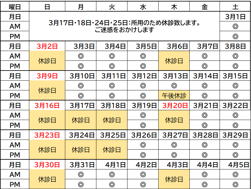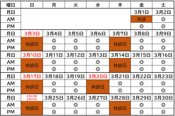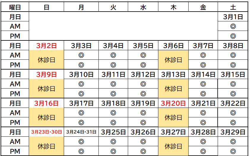 | 3月休診日 | 03日(木) 休診 10日(木) 休診 17日(木) 休診 31日(木) 休診 |