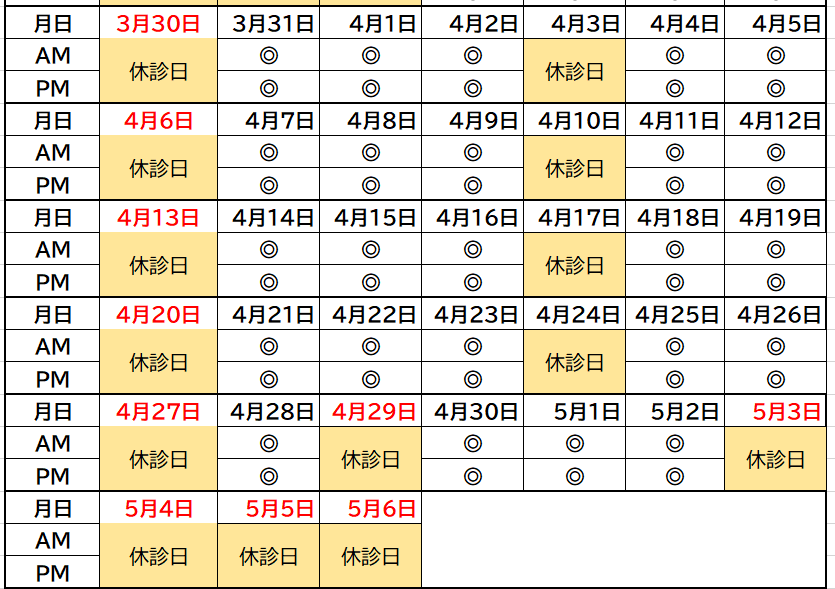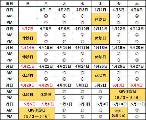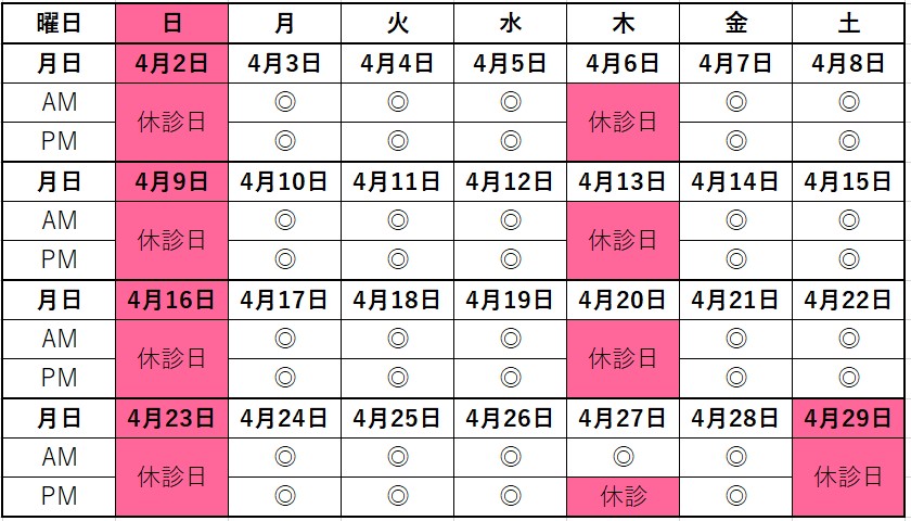 | 4月休診日 | 07日(木) 休診 14日(木) 休診 21日(木) 休診 29日(金) 祝日のため休診 28日(木) 診療致します |