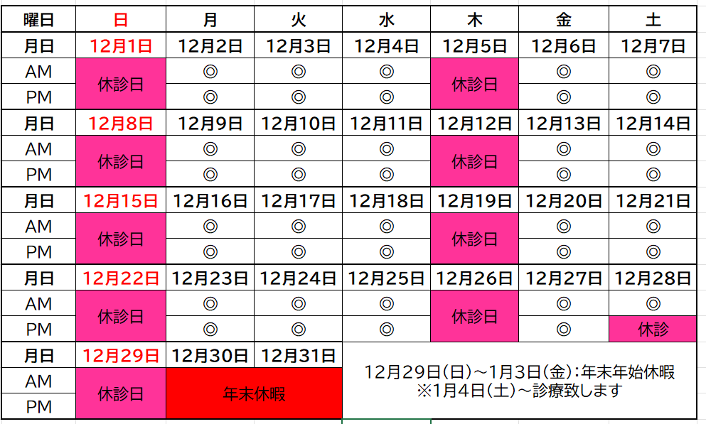 | 12月休診日 | 01日(木) 休診日 08日(木) 休診日 15日(木) 休診日 22日(木) 午後休診 28日(水) 午後休診 【22日午前・28日午前は診療します】 |
